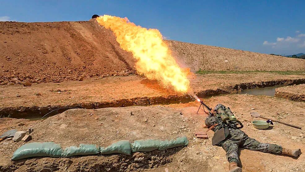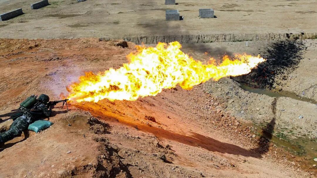 “注意,前方发现敌火力点,立即实施喷火打击!” 训练场上,喷火兵背负喷火器,低姿穿越战壕、规避“敌”火力,快速抢占阵地。随着指令下达,他们扣动扳机,火焰喷涌而出,瞬间吞没百米外的暗堡、涵洞等模拟目标,现场热浪灼人。