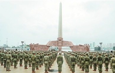 “我是中国人民解放军军人,我宣誓……”领誓人的声音铿锵有力。誓言声声,字字千钧,在英雄广场上空激荡,与不远处海浪的澎湃声交织在一起。