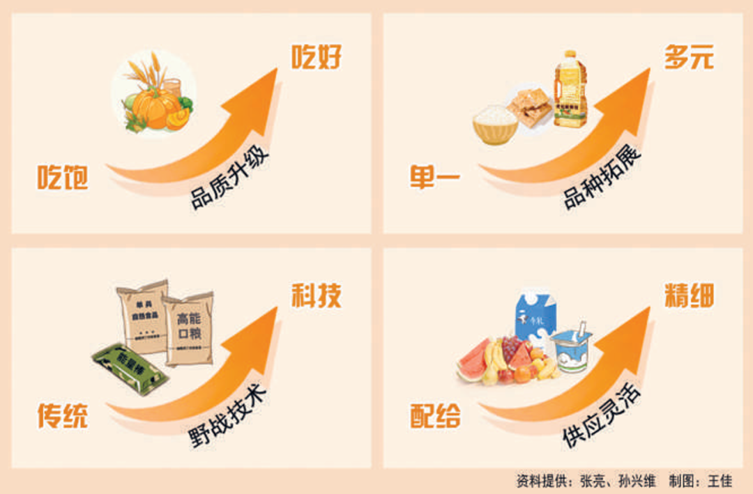 随着部队练兵备战不断向实战化迈进,传统的军粮供应品种和范围难以满足部队多样化需求。为此,全国军粮主管部门坚持问题导向,对传统的军粮供应品种、范围等进行调整,创新实行军粮供应品种串换制度,更好满足部队膳食营养搭配、战备训练和遂行多样化军事任务军粮保障需要。