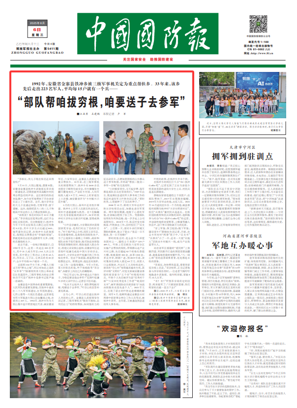 1992年,安徽省金寨县铁冲乡被三级军事机关定为重点帮扶乡。33年来,该乡先后走出223名军人,平均每15户就有一个兵——“部队帮咱拔穷根,咱要送子去参军”