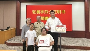 仪式现场,张衡宇烈士之子张纪宇作为烈属代表,将张衡宇烈士证明书郑重交给纪念馆工作人员。工作人员向张衡宇烈士亲属颁发收藏证书。
