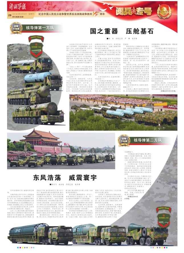 受阅的“惊雷-1”空基远程导弹、“巨浪-3”潜射洲际导弹、“东风-61”陆基洲际导弹、“东风-31”新型陆基洲际导弹,首次集中展示我军陆、海、空基“三位一体”战略核力量,是维护国家主权、捍卫民族尊严的战略“王牌”。